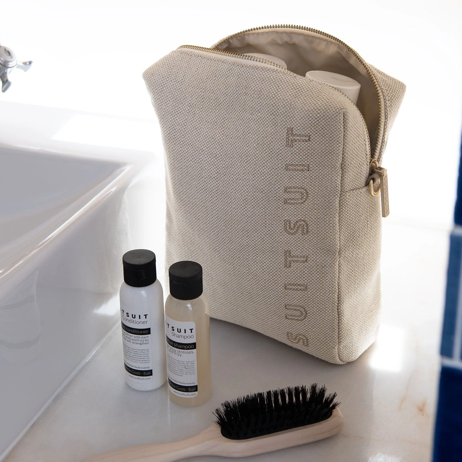 Heb je een trip gepland en neem je het liefst al je beauty essentials mee? Dan is de upright toilettas is een mooie toevoeging aan jouw vakantie. Zorg ervoor dat je zonder moeite je full-size shampoo, conditioner en bodylotion mee kan nemen. Door het fijngeweven katoen geef je je verzorgingsproducten direct een luxe uitstraling.